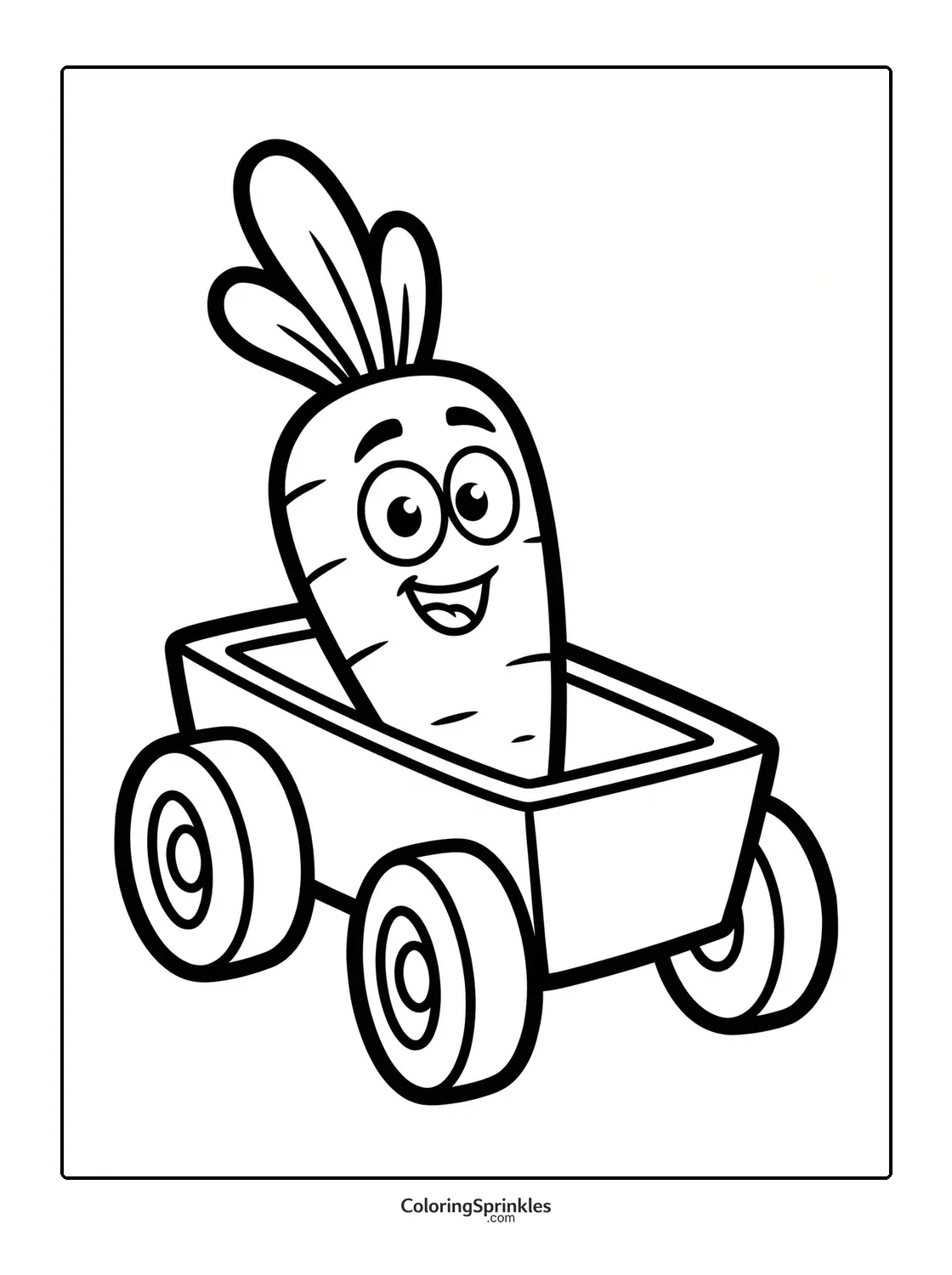 A happy carrot character with big eyes sitting inside a wheeled cart ready for coloring.