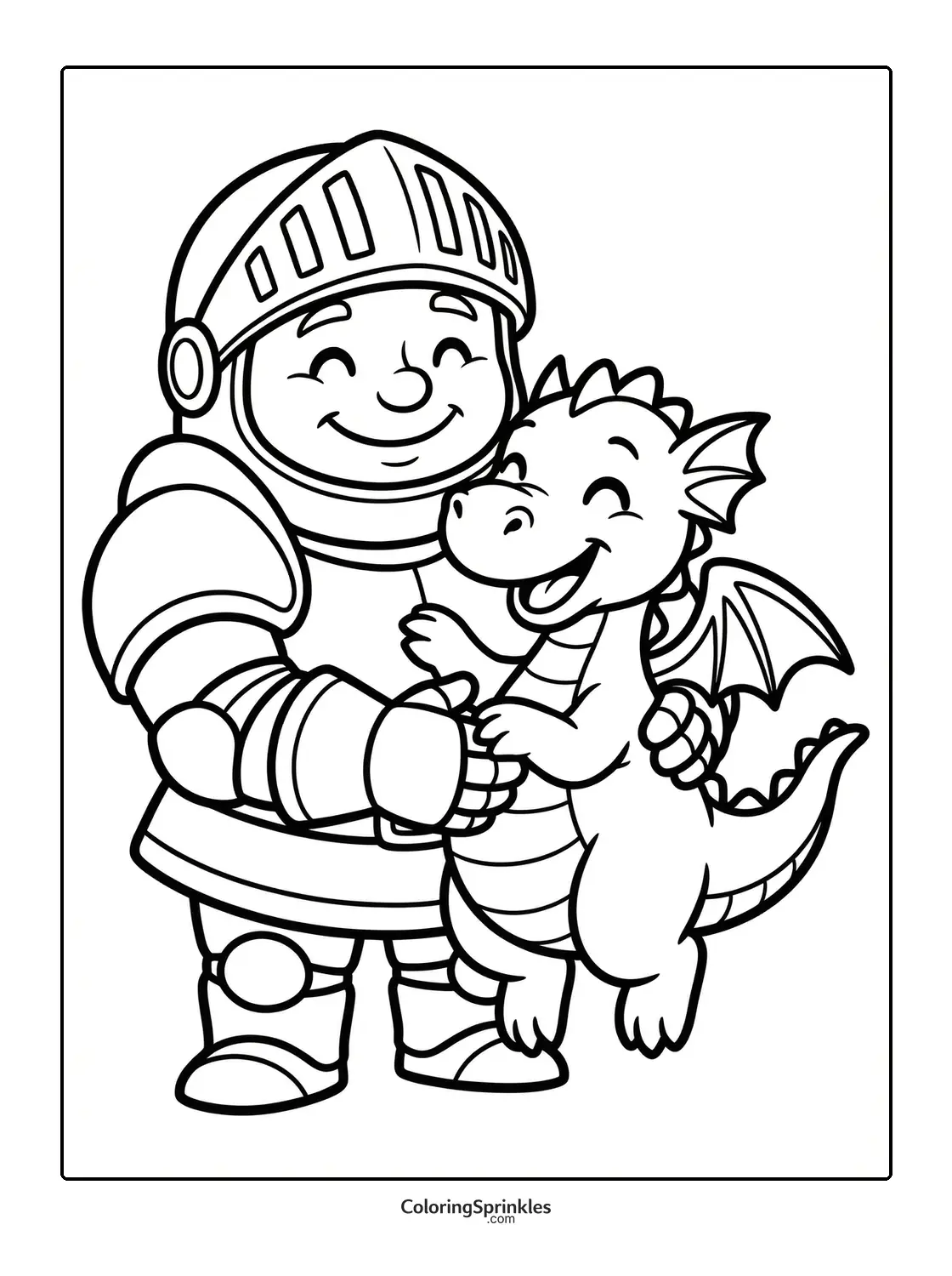 A detailed coloring page featuring a smiling knight in horned armor standing next to a friendly dragon with wings.